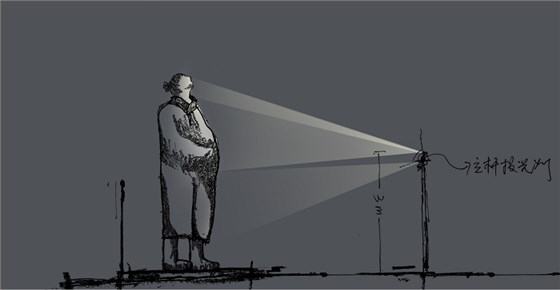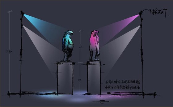 《高山流水》青銅雕塑,參考秦兵馬俑的照明手法,以白色燈光重點照亮雕塑頭部,仿佛在迎著陽光沉思。