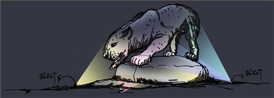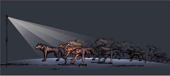《狼來了》百匹狼群,以重點照明的方式著重刻畫頭狼及狼群的氣勢。狼群的后部,在狼眼處涂抹熒光粉,配合黑光燈,使狼眼在黑暗處散發出寒光。從整體上感覺狼群漸漸從黑暗中走出,給人一種狼來了的動態氣勢。