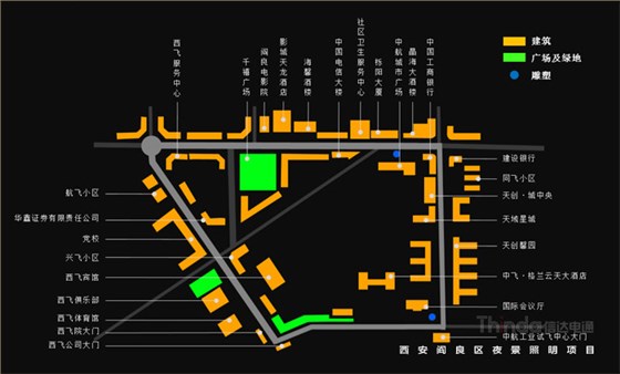 本區域亮化規劃策略要確定閻良區夜景亮化設計策略需考慮的因素,利用閻良區已基本形成的道路系統、廣場、公園、綠地,來構建閻良區夜景亮化系統。同時亮化規劃設計策略從示范街擴展到整個閻良區的亮化總體規劃,本次亮化雖然是示范區,但亮化設計的整體高度是從整體區域著手的,示范區延續整體區域的亮化設計思路,貫穿科技與技術的設計創新,結合高效節能的設計目標,遵循人性化的亮化設計原則,為閻良區進行適應城市發展的、能夠長期為城市使用的亮化規劃設計。