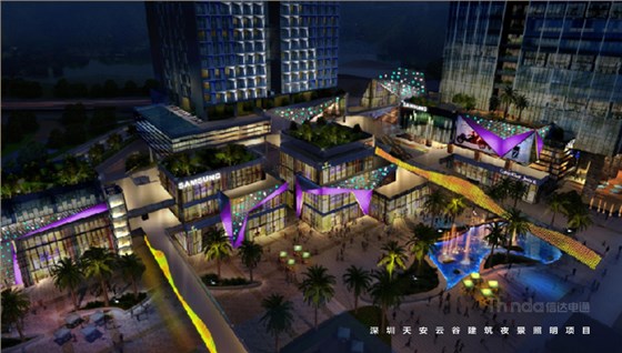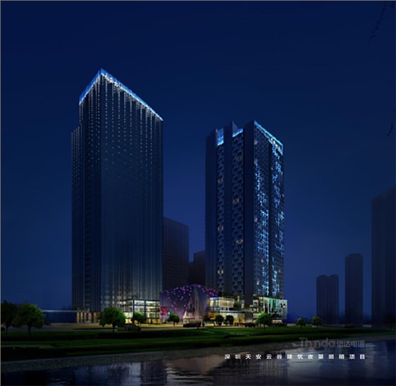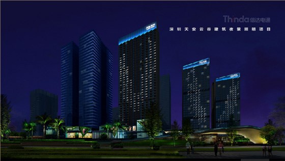 深圳天安云谷夜景照明建筑本身由建筑主體元素延伸至頂部,突出建筑高度和在夜間的遠觀效果,材質為玻璃幕墻。辦公樓建筑立面材質為玻璃為主,立面結構縱向延展性好。